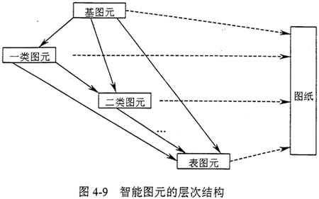 可繼承性:一個智能圖元不僅可以是其他智能圖元的父圖元,也可以是一個或多個智能圖元的子圖元,最底層的智能圖元稱為基圖元,他們沒有父圖元;最上層的智能圖元稱為表圖元,他們沒有子圖元,其集成度最高;就象一個機器的裝配圖由若干個零件圖組成,而一個零件圖是由若干個結(jié)構(gòu)單元組成,整個智能圖元集合屬于一種比較復(fù)雜的層次結(jié)構(gòu),如圖4-9。