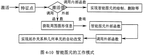 通過對特征點的激活,首先判斷激活值,是調(diào)用外部函數(shù)還是調(diào)用內(nèi)部函數(shù),如果是調(diào)用內(nèi)部函數(shù),則根據(jù)激活值,調(diào)用某個內(nèi)部函數(shù),實現(xiàn)智能圖元自身的操作,如刪除、放大、旋轉(zhuǎn)等等;如果是調(diào)用外部函數(shù),則再獲取周圍圖元信息,并以此查詢外部函數(shù)庫,得到某個外部函數(shù),則調(diào)用此外部函數(shù),實現(xiàn)智能圖元的拓?fù)潢P(guān)系和幾何單元信息的改變。(如圖4-11所示)